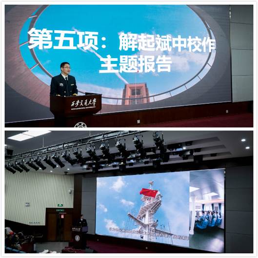 最后,海军钱学森船政治委员解起斌中校作了题为“逐梦海洋,钱学森精神引领我们不断前行”的主题报告,报告中介绍了钱学森船的基本情况,以及部队在传承弘扬钱学森精神方面的具体事例。报告中指出,海军91937部队用钱学森淡泊名利,无私奉献,追求卓越,勇攀高峰的精神,来教育激励官兵忠于职守,锐意创新。在场师生均被中国海军临危不惧、舍小家而顾大家、永远忠于党和国家的高风亮节深深打动。