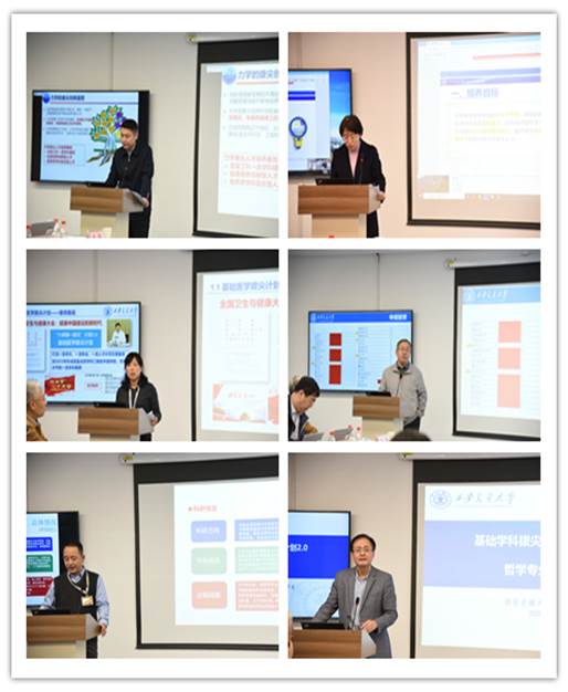 来自7个学科申报小组负责人分别就其目前准备的基地建设方案、培养方案以及附件支撑材料进行了汇报。专家们经过审阅材料、听取汇报后,提出了进一步提升的建议。主要包括:各学科应进一步挖掘亮点凝练特色,明确目标定位;加强学科交叉,加大学科间的合作融合,增强学科相互渗透;先进的教学理念和教学模式应有数据与例子作为支撑;收集培养成果,将教学成果奖、优秀毕业生成果及获奖情况等充分展示;支撑材料内的数据与申报方案中的数据、理念、师资等相匹配。