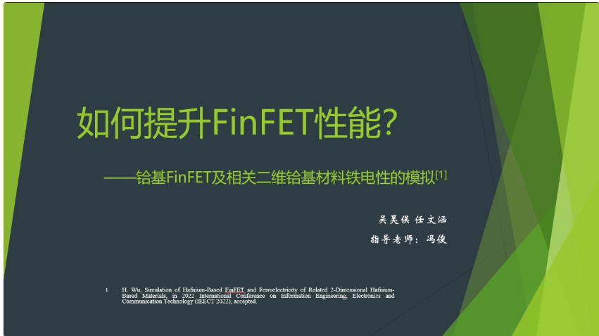吴昊俣、任文涵参赛的项目是在物理学院冯俊老师的指导下进行的。项目主要是利用Silvaco TCAD对FinFET模型进行仿真,结果表明负电容铪基FinFET具有高开关比和更陡亚阈值摆幅的优点。当栅压为1.0V时,铪基FinFET的漏极电流是硅基FinFET的3.52倍,开/关电流比也由3.9×10^5提升至1.5×10^6。此外,还利用VASP对二维二氧化铪插入层进行了模拟以显示铁电性,证明了使用二维二氧化铪插入层达到负容量FinFET的正确性。