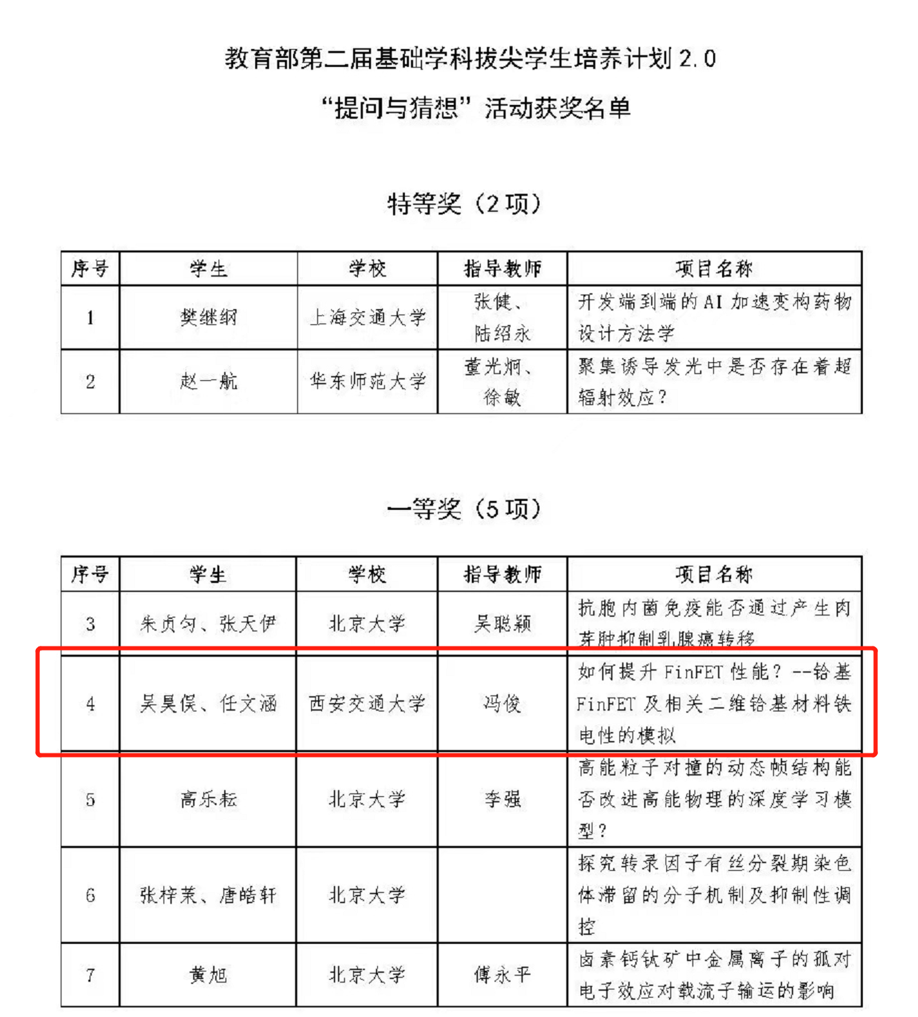 第二届“提问与猜想”活动由教育部组织,依托“拔尖计划2.0”全国线上书院举办,活动面向77所拔尖计划2.0实施高校的学科基地在校本科生开展,旨在引导学生面向世界科技前沿、面向经济主战场、面向国家重大需求,发现和提出原创性问题、应答挑战性问题,以思维创新、方法创新、理论创新激发科学兴趣、探索未知世界。活动分为高校推荐、专家评审和答辩交流三个环节,共有101个参赛项目,经过激烈角逐,最终18个优秀项目脱颖而出。吴昊俣和任文涵的参赛项目荣获一等奖。