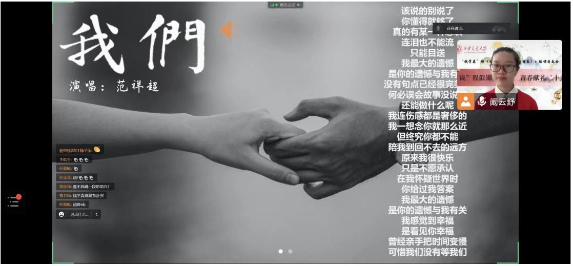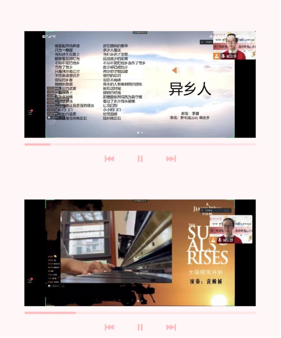 “云”音乐会由来自智造钱2201的阚云舒同学主持,她为线上音乐会的顺利举行做了很多准备工作。开场时,课程负责人曹耿献老师对同学们的付出和努力表示衷心感谢,她说:“正因为在疫情中大家“青春的热情”才能够点燃线上的“云”音乐会,《艺术欣赏与创作(音乐)》同学们的风采也才能呈现给所有的观众们。”