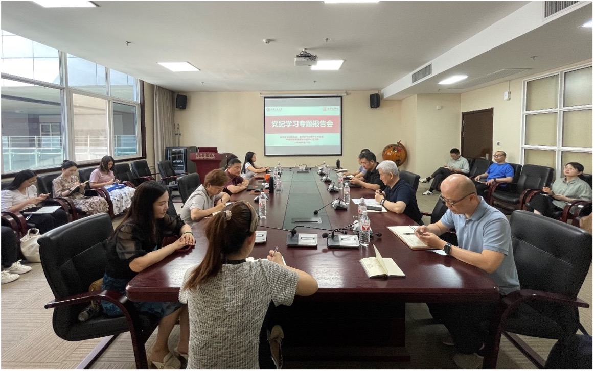 申丹围绕党的纪律建设的重要性,及六大纪律的具体内容做了党纪学习专题报告,通过一系列党员干部的违纪案例重申党纪学习的必要性。他表示纪律严明是我们党的光荣传统和独特优势,加强纪律建设是我们党长期以来的宝贵经验,要将理论学习、纪律规矩与实际工作紧密结合,把对《条例》的深入理解与解决问题相结合,切实把理论学习转化为做好学校各项工作的新思路。