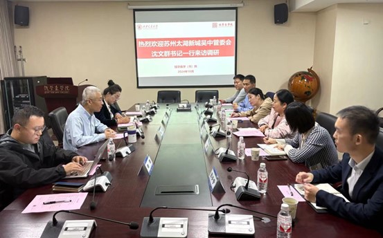 1012日下午,苏州太湖新城吴中管委会沈文群书记一行6人来院调研。beat365正版唯一官网常务副院长杨森及学院相关负责老师出席座谈会。