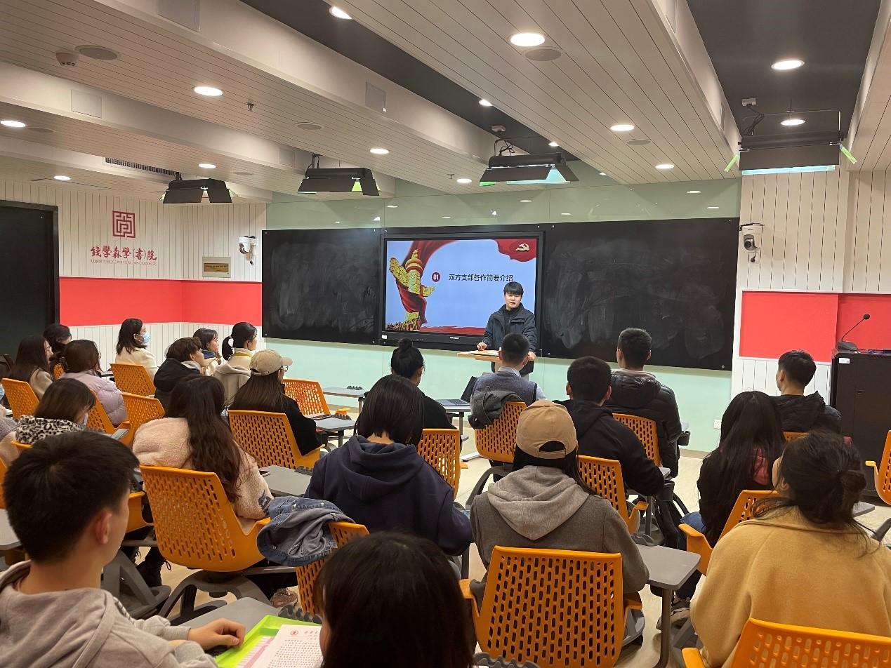 会议第一项,两个支部的党支部书记分别就本支部的基本情况进行了简要介绍,同时硕1114党支部书记彭随缘同志对未来支部间加深沟通交流提出了期望;知行党支部书记李龙飞同志对硕1114党支部关于理论学习方面分享经验、提供指导表示了感谢。