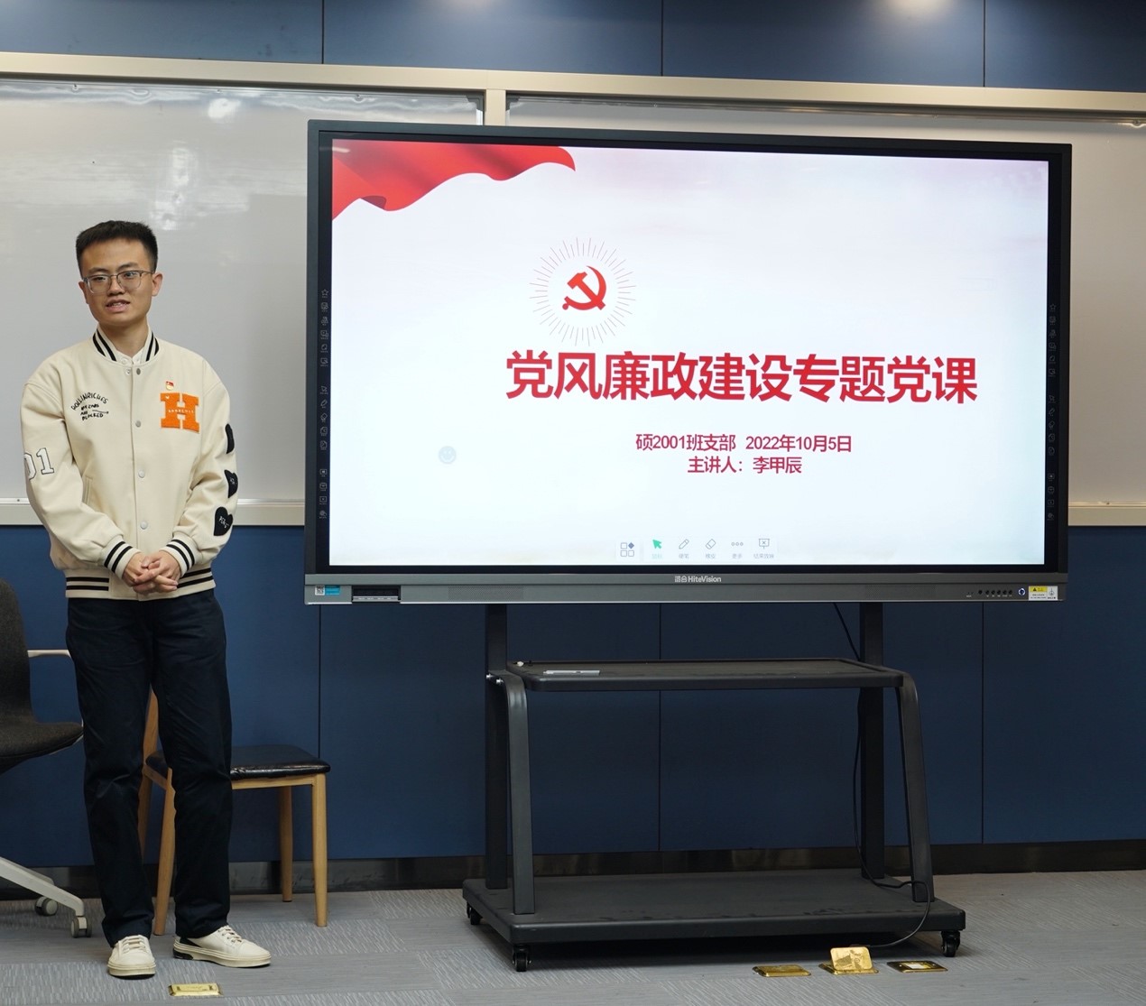 在党风廉政建设专题领学中,硕2001党支部的李甲辰同志首先引述了党的十九大对推进全面从严治党走向纵深作出的新部署,指出新时代全体党员必须加强修养和锻炼坚强党性。然后,他从重视党内生活、加强改进作风、发挥引领作用与明确衡量尺度四个方面分享了加强党性修养和锻炼的具体方法。从实际工作角度出发,李甲辰与在座同志一起回顾了《学生会、研究生会干部自律公约》,强调学生干部必须始终坚持为人民服务的宗旨,实心实意帮助同学解决困难,不借担任职务谋求私利,力戒模仿行政化的工作方式,坚决反对漂浮作风、形式主义。