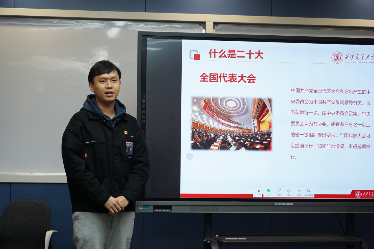 接着,来自钱学森书院笃学党支部的吴弘毅同志就党的二十大相关理论知识进行了分享。他首先介绍了二十大的职权、使命、议程等基本知识,并介绍了二十大的重要历史意义。党的二十大是我们党进入全面建设社会主义现代化国家、向第二个百年奋斗目标进军新征程的重要时刻召开的一次十分重要的代表大会,是党和国家政治生活中的一件大事。最后,他从学习历次全会精神、习近平新时代中国特色社会主义思想等方面指出了展望迎接二十大的努力方向。
