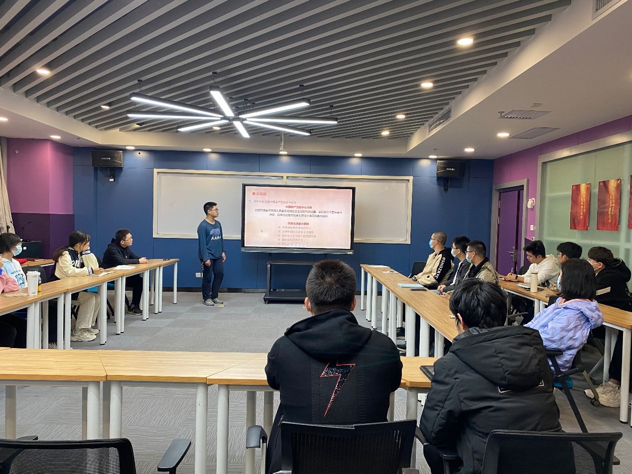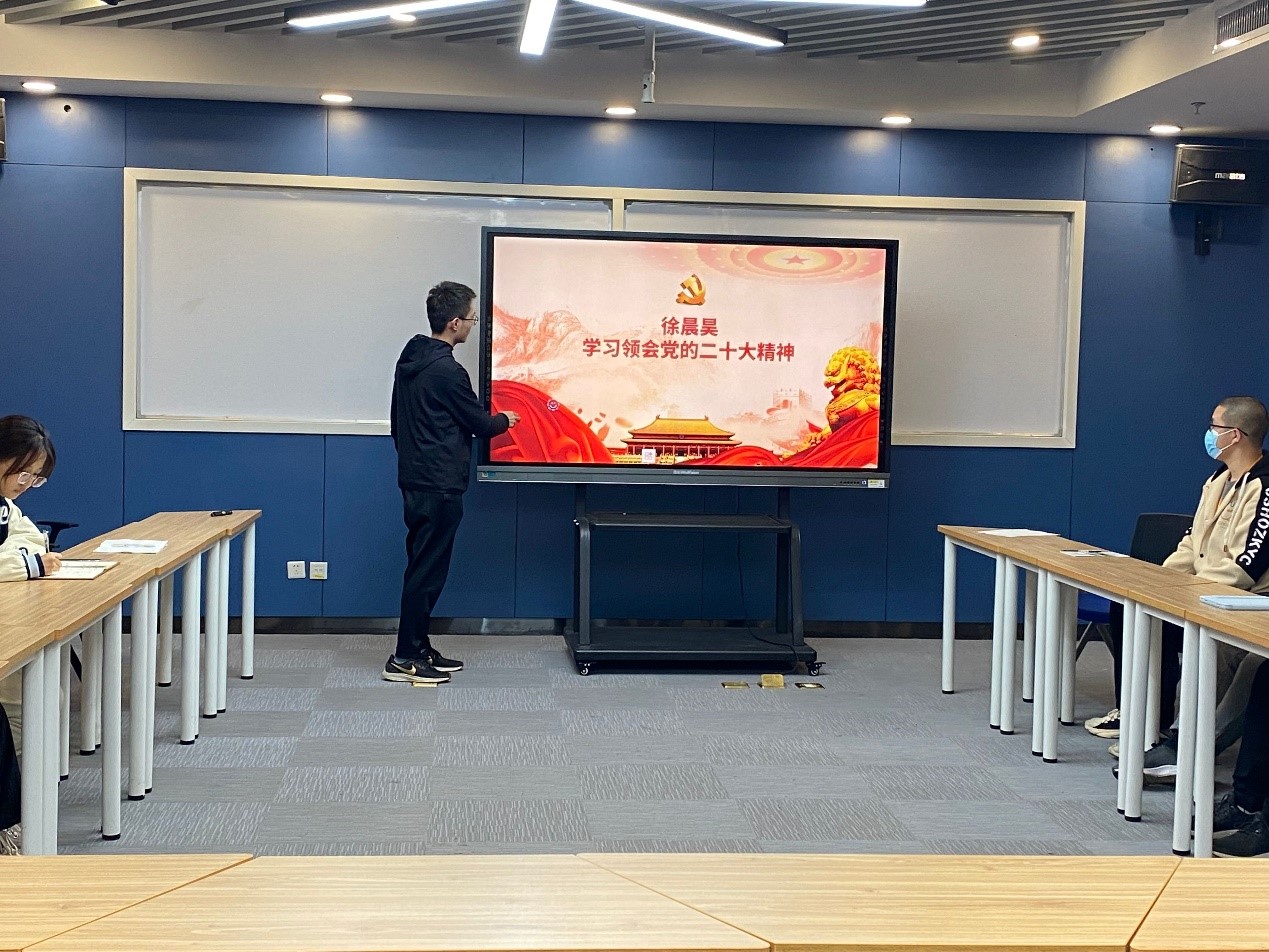 会议第一项,由陈泓宇同志带领大家学习了党的二十大报告重要内容。首先,陈泓宇同志为大家阐明了“二十大”的具体含义,紧接着从十五个方面分析了党的二十大报告,其中包括我党过去五年以及新时代十年的伟大变革、开辟马克思主义中国化时代化新境界的六大坚持、新时代新征程中国共产党的使命任务、加快结构发展格局,着力推动高质量发展、推进科教兴国战略等重要内容,并着重介绍了建党百年的伟大历史成就和青年在党的建设和国家发展中的重要作用。“青年强,则国家强”,这是对参会的所有青年同志发出的强有力的号召,再次明确了党对青年同志“听党话,跟党走”的具体要求。在分享的最后,陈泓宇同志还呼吁大家进一步关心国家大事,加强理论学习,提高个人素养。
