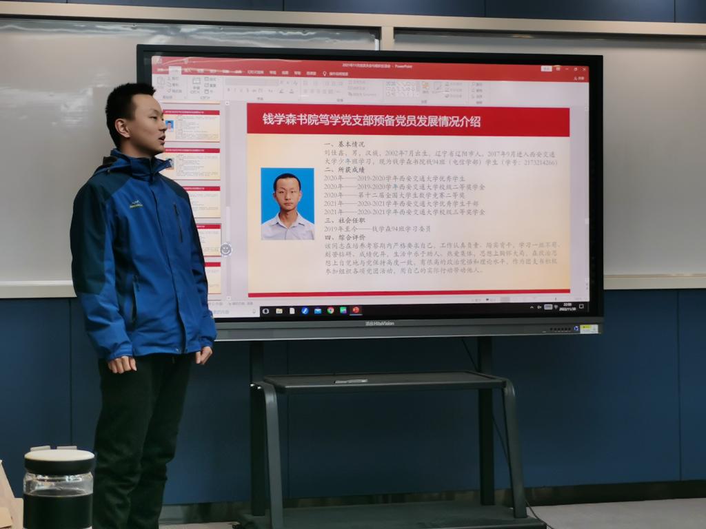 会议第二项是讨论接收徐海涛等七名同志为中共预备党员的事宜。徐海涛等七名同志表明了自己加入中国共产党的意愿,并简要讲述了自己的个人情况。魏成骁同志汇报了本学期发展对象评选的标准与流程,并对徐海涛等七名同志的发展事宜发表了意见