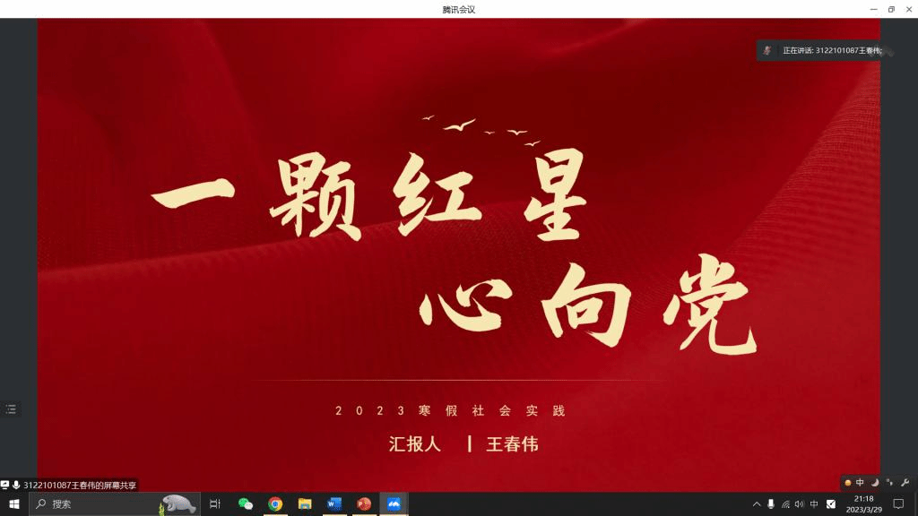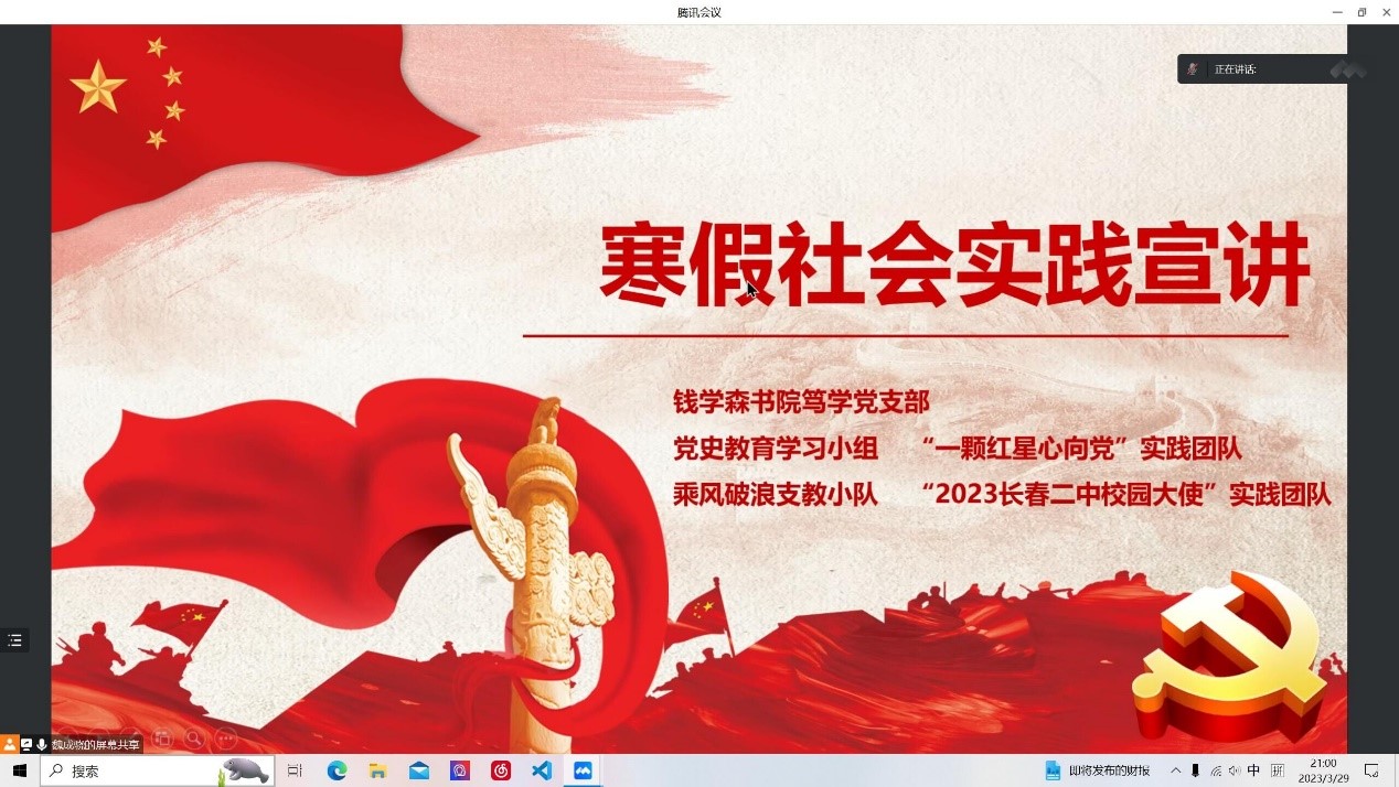 3月29日晚21点,钱学森书院笃学党支部邀请了今年寒假社会实践活动中获评院级优秀的四支队伍,对社会实践内容进行宣讲和分享,活动由支部书记魏成骁主持。