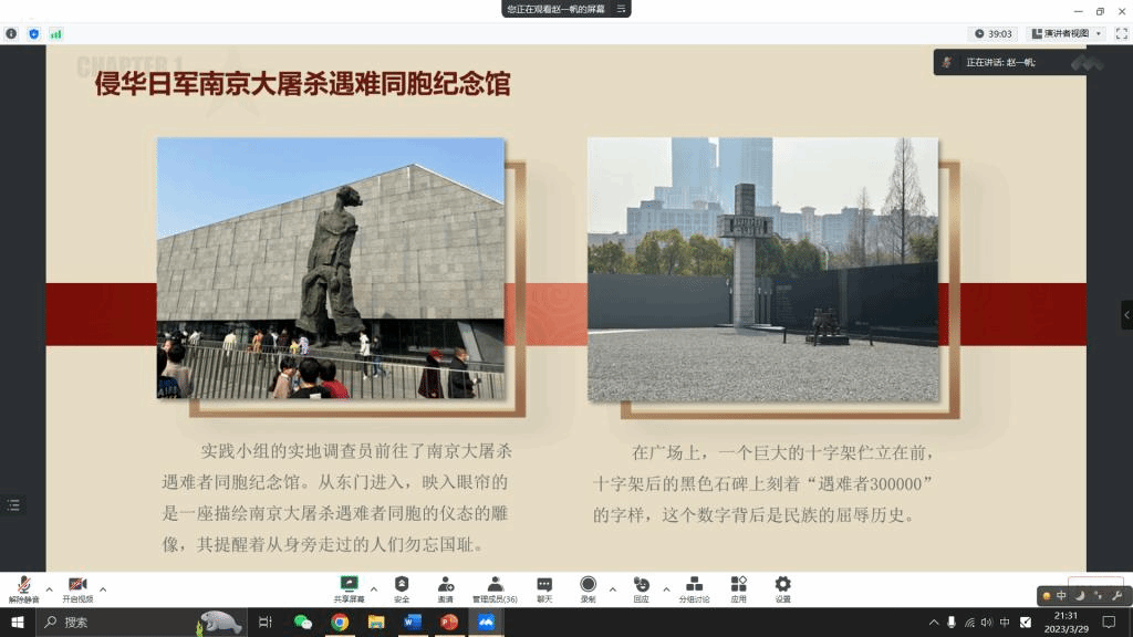 第三支带来分享的社会实践队伍是党史教育学习小组,分享的主题是“溯源红色基因 助力文化传承”。该小组的活动以线上线下结合的方式进行:线下部分,队员们前往各自家乡的红色文化传承地,包括聂耳故居和侵华日军南京大屠杀遇难同胞纪念馆。通过实地前往、收集相关资料并采访当地居民,队员们深入了解了聂耳的生平与创作国歌的心路历程。侵华日军南京大屠杀遇难同胞纪念馆用雕塑、照片、视频和实物向参观者详细展示了侵华日军曾经犯下的滔天罪行。队员们参观了纪念馆的史实展,细致了解了南京大屠杀中南京人民、南京城遭遇的空前劫难。线上部分,队员们参加了西安交通大学党建学习平台“学习党的二十大精神”专题网络培训。