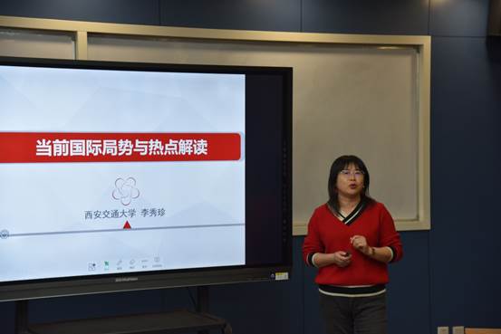 最后由陕西省“党史宣讲团”成员李秀珍教授为师生党员作《当前国际局势与热点解读》专题讲座。她从当前国际热点和国际形势为出发,强调要树立正确的历史观、大局观、角色观,传承钱学森思想,弘扬科学家精神,肩负新时代的历史使命。