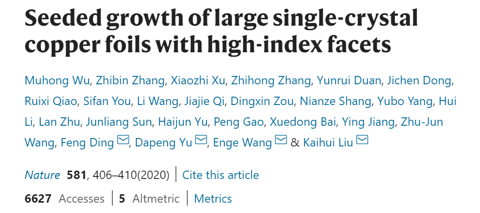 2020527 Seeded growth of large single-crystal copper foils with high-index facets (https://www.nature.com/articles/s41586-020-2298-5)
