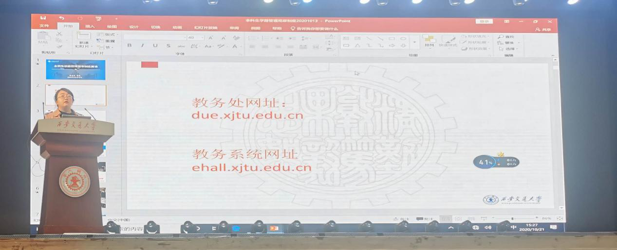 首先,教务处贺进老师介绍了交大的教务方案并解读了学籍管理政策。贺进老师指出,同学们应当选择过一个充实的大学生活,提起行囊,积极面对更多的大学考验。同时,贺老师对新生应当怎样接受大学教育、大学教育有什么特点、如何度过一段充实的大学生活作出了详细指导。