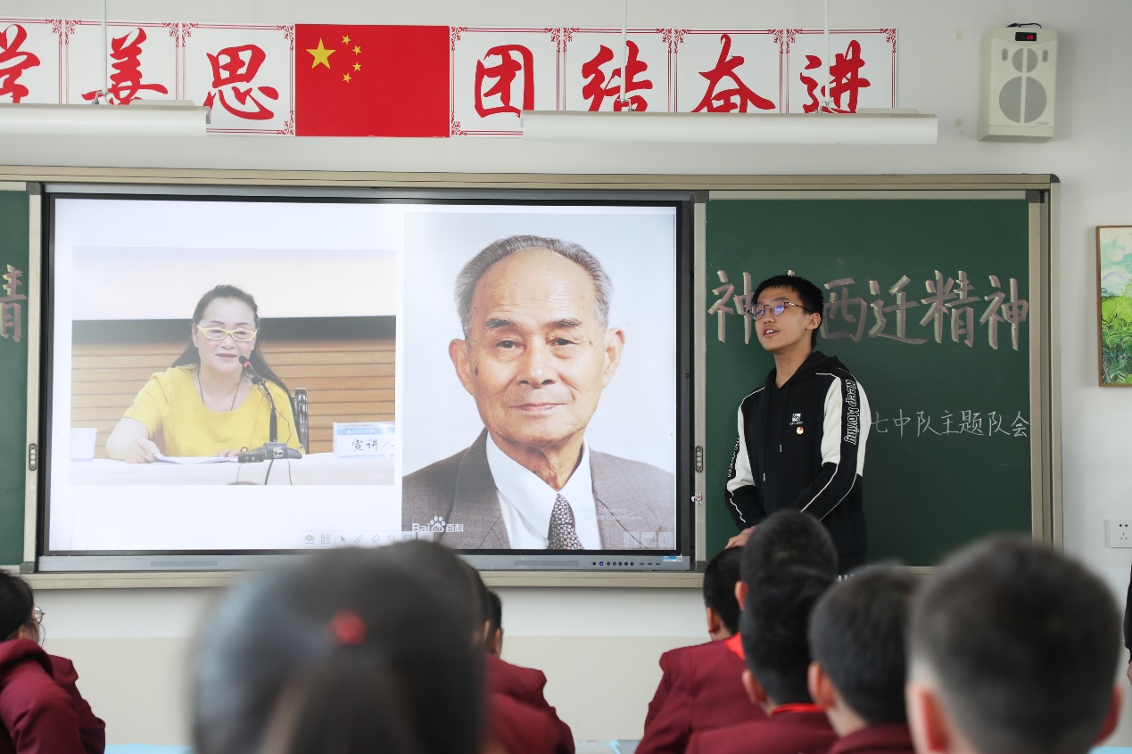 少年班武靖博同学讲述了杨积应先生的故事,他提到西迁,不仅是前辈们坚强意志,不畏困难的体现,更是爱国主义的发扬与传承。他呼吁曲江一小的孩子们以实际行动去践行西迁精神,努力学习,早日成为社会主义的合格建设者和接班人。