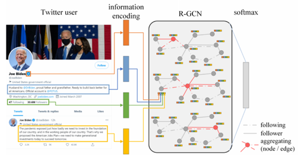 在此基础上,我们团队把重心转移到了境外的社交平台Twitter上,经过调查研究后发现现有的机器人账户检测的模型存在两个问题——泛化性和适应性。为了解决这个问题,需要一个更加完整的数据集以及完善的收集方案。所以,我们提出了一种基于BFS的数据收集方案,通过Twitter API,实现了自动收集以一特定用户为中心,收集该用户公开的、多模态的数据的程序。最终,收集到了含有大约22万条用户多模态信息的数据,是目前规模最大,信息最丰富的数据集,TwiBot-20。该成果已经被CIKM2021接收,并且开源了数据集,目前已有50多位国际学者使用该数据集进行研究。并且已被知名机器人数据集收集平台Bot Repository收录。