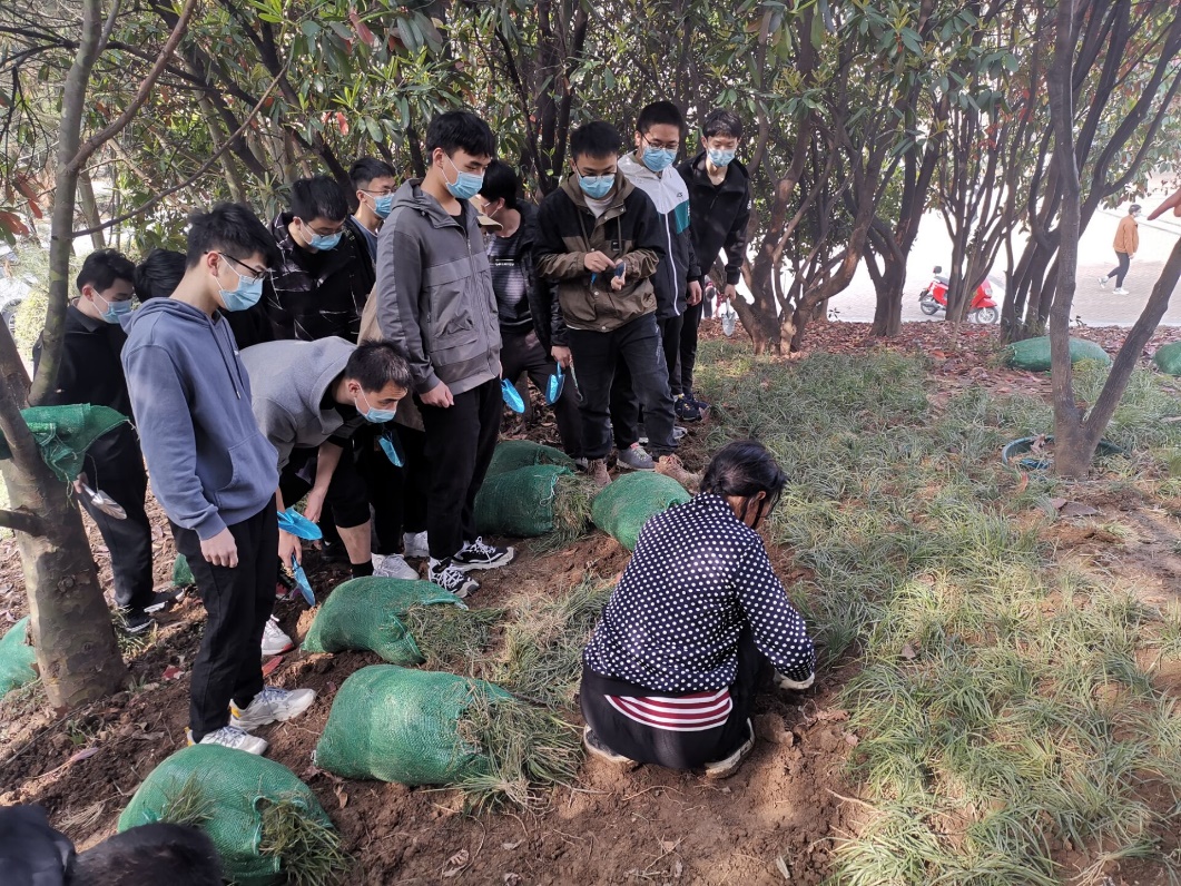 在学习种植技巧后,同学们很快沿着原有的麦冬草种植带开始劳动。和煦的春风吹拂着同学们的脸庞,温暖的春光被绿叶剪成碎影洒落在劳动着的同学们的背上,挥锹铲土,填苗压土,固苗夯土,同学们在完成自己的劳动工作之余协力合作,将原本裸露的土坡上种出了行列整齐、间隔有序的麦冬草丛。