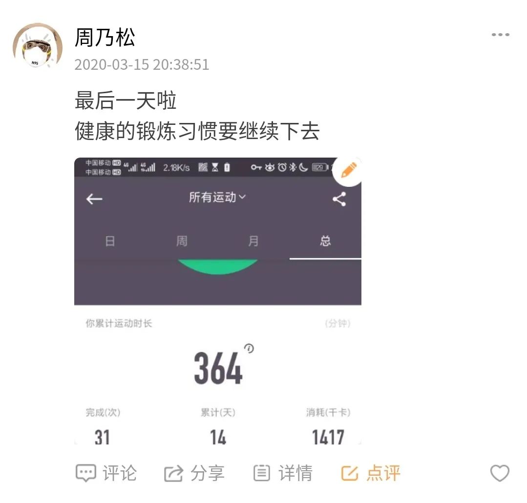 锻炼身体,贵在坚持。此次居家锻炼中同学们最大的收获不仅仅是一个学分,还是很可能将伴随一生的宝贵习惯。